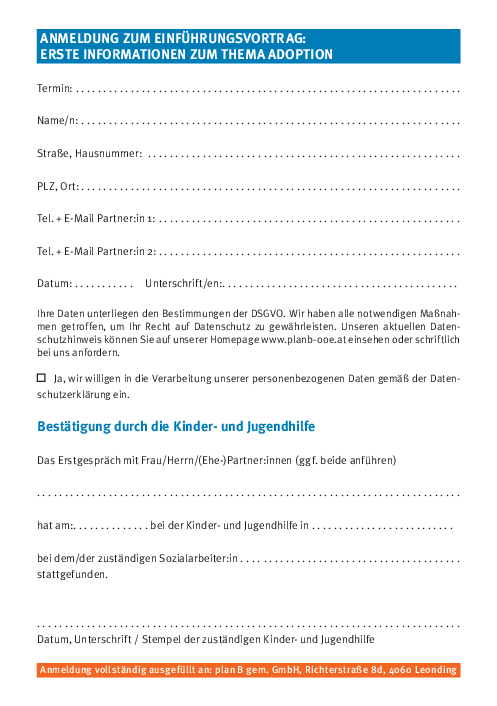 Im Falle einer Abmeldung nach erfolgter Zusage entsteht eine Bearbeitungsgebühr in Höhe von 10,00 Euro. Diese Veranstaltung bietet Erstinformationen über Adoption für alle, die überlegen ein Adoptivkind aufzunehmen. Die Teilnahme ist Voraussetzung für die weitere Bewerbung als Adoptiveltern bei der zuständigen Kinder- und Jugendhilfe.